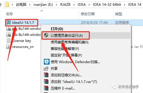 1.返回到开头解压的【IDEA 14】文件夹,选中【ideaIU-14.1.7】安装程序,鼠标右击选择【以管理员身份运行】。