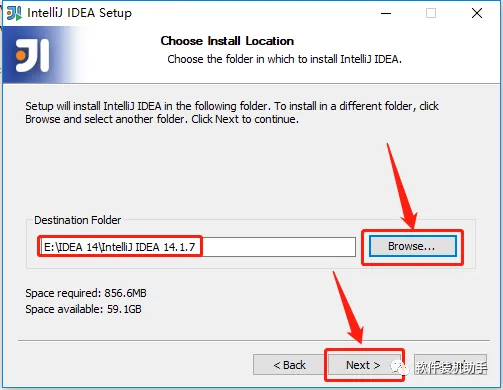 4.点击【Browse】设置软件的安装路径,建议安装在除C盘之外的磁盘,可以在E盘新建一个【IDEA 14】的文件夹,然后点击【Next】。(ps:这里的安装路径建议和教程里的保持一致,后面破解需要)