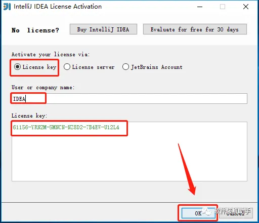 11.选择【License key】,【name】下输入:IDEA,【Licese key】下面输入:61156-YRN2M-5MNCN-NZ8D2-7B4EW-U12L4,然后点击【OK】。