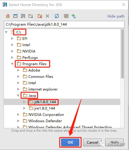 16.打开【C:\】目录,然后打开【Program Files】目录,继续打开【Java】目录,然后选择【jdk1.8.0_144】目录,选择好后点击【OK】。