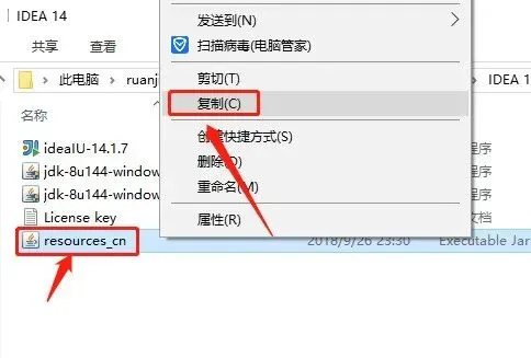 22.返回到开头解压的【IDEA 14】文件夹,鼠标右击【resources_cn】文件选择【复制】。