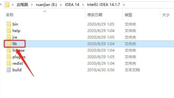23.这里需要打开IDEA软件安装目录中的【lib】文件夹,打开路径为:【E:\IDEA 14\IntelliJ IDEA 14.1.7\lib】,打开【IDEA 14】文件夹。