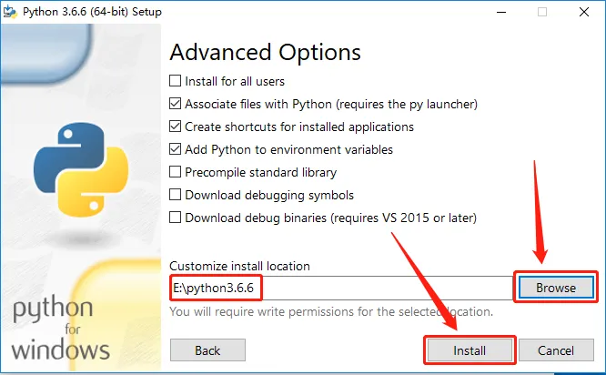 7.点击【browse】设置软件的安装路径,建议在E盘或其他磁盘新建一个【Python3.6.6】文件夹,设置好安装路径后点击【Install】。