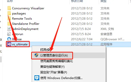 4.鼠标右击【vs_ultimate】安装程序,选择【以管理员身份运行】。
