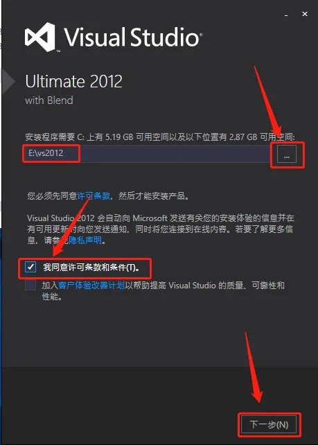 5.点击【···】设置软件的安装路径,可在除C盘以外的其它盘新建一个“VS2012”的文件夹,设置好安装路径后勾选【我同意许可条款和条件】,然后点击【下一步】。