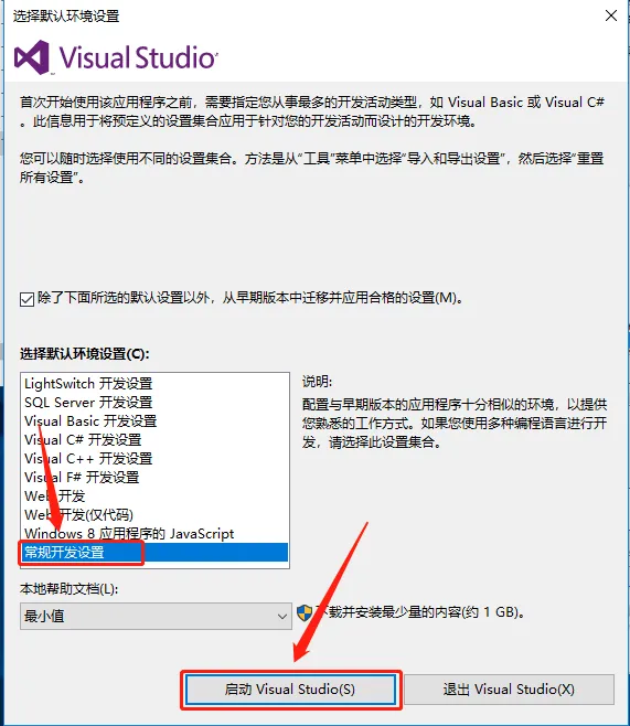 9.选择【常规开发设置】,帮助文档选择【无】,点击【启动VisualStudio】。