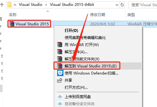 1.打开下载好的软件安装包,鼠标右击压缩包选择【解压到Visual Studio 2015】。