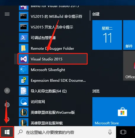 16.关闭并重启软件,点击左下角的开始菜单栏,在菜单栏中找到并打开【Visual Studio 2015】,用鼠标点住【Visual Studio2015】不放往桌面上拖动即可创建快捷方式。