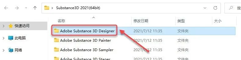 2.打开解压后的文件夹,双击打开需要安装的产品文件夹(如:Adobe Substance 3D Designer)。