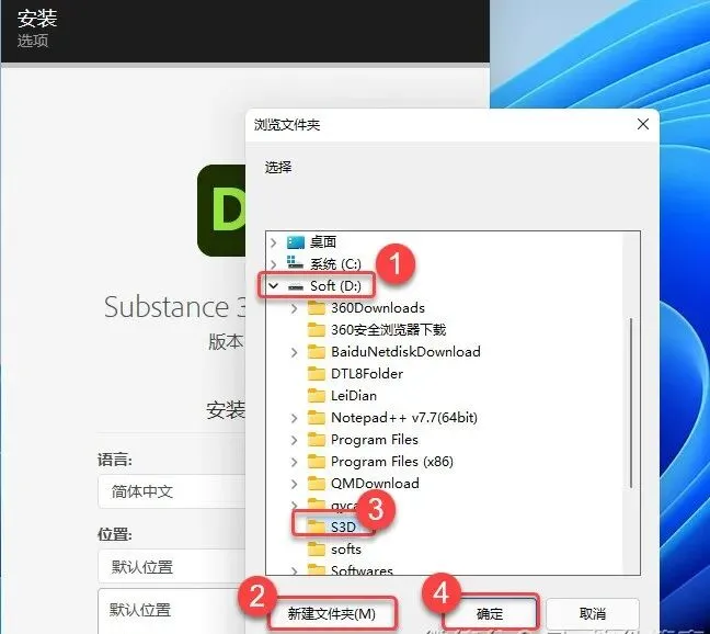 5.①点击需要安装的磁盘(我这里选择D盘);②点击【新建文件夹】;③选择并将新建的文件夹重命名为【S3D】;④点击【确定】。
