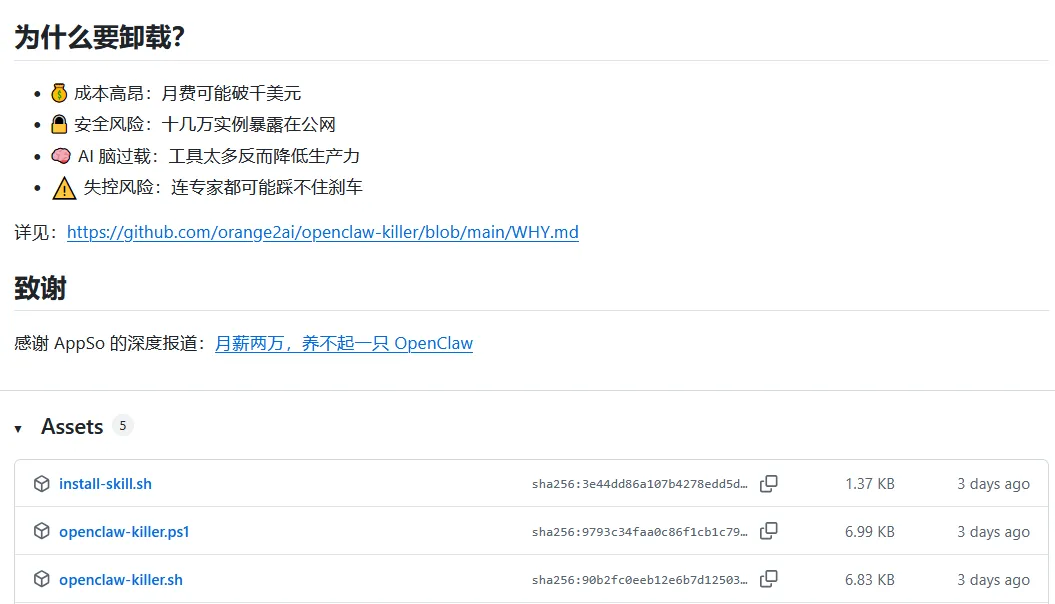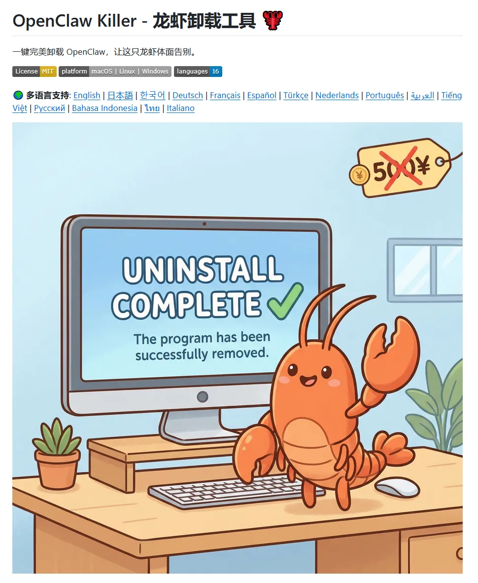 开源免费,立省299,openclaw一键卸载工具!OpenClaw这款工具在技术圈掀起了一阵热潮,不少人跟风安装体验。然而,随着官方呼吁“理性安装”以及网络上不断曝出的各种风险,许多用户开始意识到:装 OpenClaw 容易,想卸载干净却没那么简单。更戏剧的是,网友们的玩梗已经从上门代装转变成上门代卸,收费依旧不菲。那么该如何安全、彻底、免费地卸载这只“龙虾”?今天分享迷就给大家分享一款开源免费的 OpenClaw 一键卸载工具 ——OpenClaw Killer不同于普通软件 “一键卸载”,OpenClaw 的高权限设计让它在系统中留下大量残留,手动删除不仅需要停服务、清配置、删状态等至少 5 个复杂步骤,还极易因操作不当导致系统崩溃,甚至留下数据泄露的后门,这也让 “代卸载” 成了一门暴利生意。面对付费卸载的智商税和手动卸载的高门槛,开发者推出了OpenClaw Killer(龙虾卸载工具),这款开源免费的工具直接解决了所有卸载难题,支持macOS/Linux/Windows三大系统、彻底清理残留,关键是完全免费。运行 OpenClaw Killer 后,工具会自动完成全套卸载流程,每一步都精准到位:其实openclaw官方也给出了卸载方式,略微复杂,适合有命令行基础的用户,而OpenClaw Killer更适合大多数普通用户——不用记指令、不用分步骤、不用怕残留,一键就能实现完美卸载。OpenClaw的强大毋庸置疑,但对于普通用户而言,高成本、高风险、高技术门槛的特性,让它暂时还不是一款全民工具,让我们期待国内厂商们跟进的更简单易用的版本吧!https://github.com/orange2ai/openclaw-killer