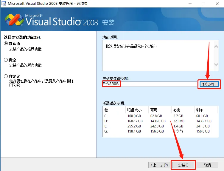 9.点击【浏览】设置软件的安装路径,可在除C盘以外的其它盘新建一个“VS2008”的文件夹,设置好安装路径后点击【安装】。