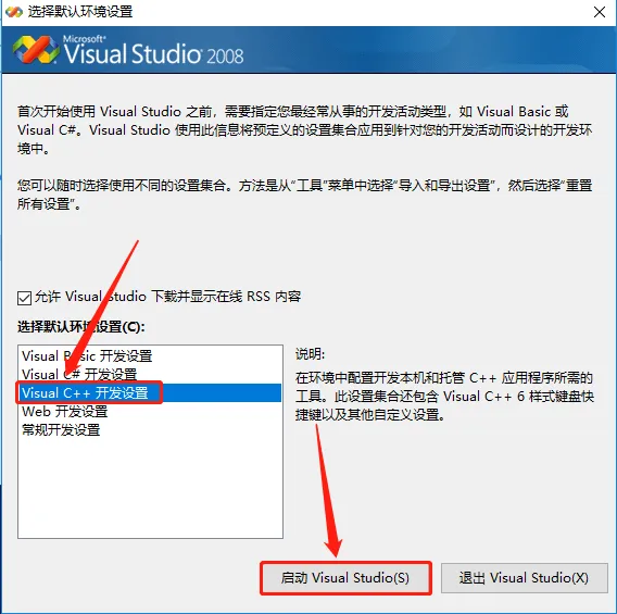 14.勾选【Visual C++开发设置】,然后点击【启动Visua Studio】。
