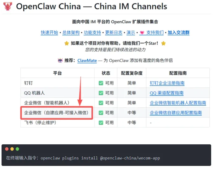 第二步:安装“转换器”,打通生态核心是通过企业微信的自建应用(理解为你在企微的“自家地盘”)来中转。打开开源仓库,执行这条命令: bash openclaw plugins install @openclaw-china/wecom-app