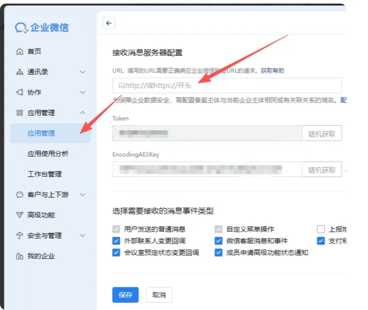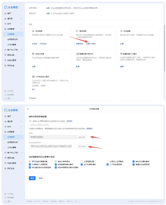Token & EncodingAESKey:在应用详情页的“接收消息”设置里,随机生成就行。