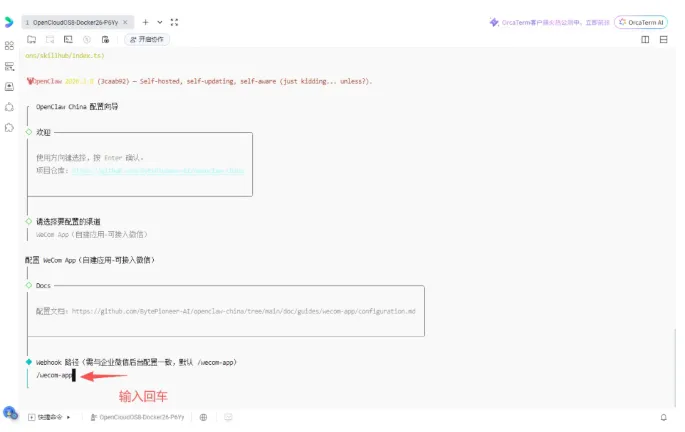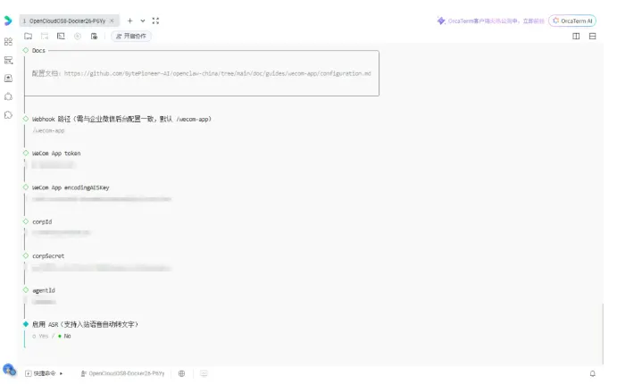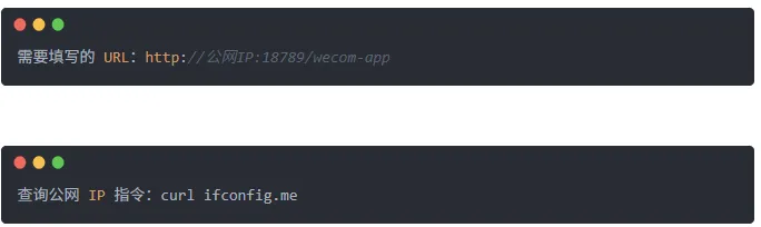 配置企业微信后台:在“接收消息”的URL里,填上这个格式: http://<你的公网IP>:18789/wecom-app。
