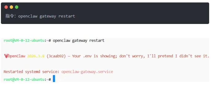最后,重启服务: openclaw gateway restart。