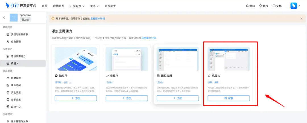 进入应用详情,找到「能力」→「机器人」,开启。
