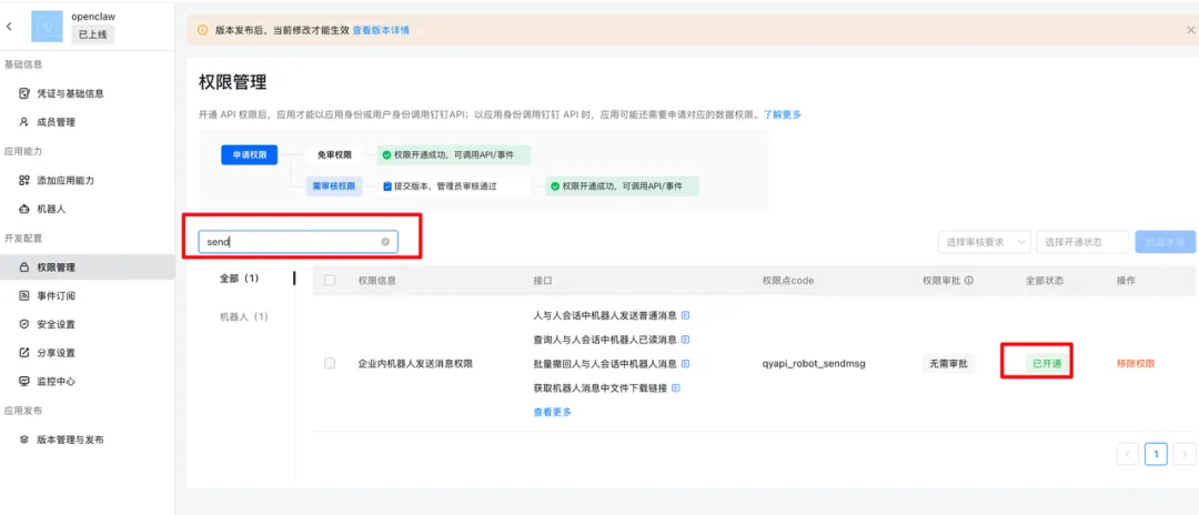 Card.Instance.Write— 创建和投放卡片实例Card.Streaming.Write— 对卡片进行流式更新qyapirobotsendmsg— 机器人消息发送相关权限这一步有三个权限必须都开通,少一个就会报错。