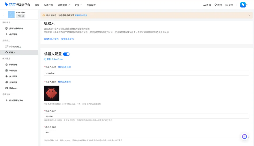 点击机器人,修改机器人配置,填入必填项就好了,