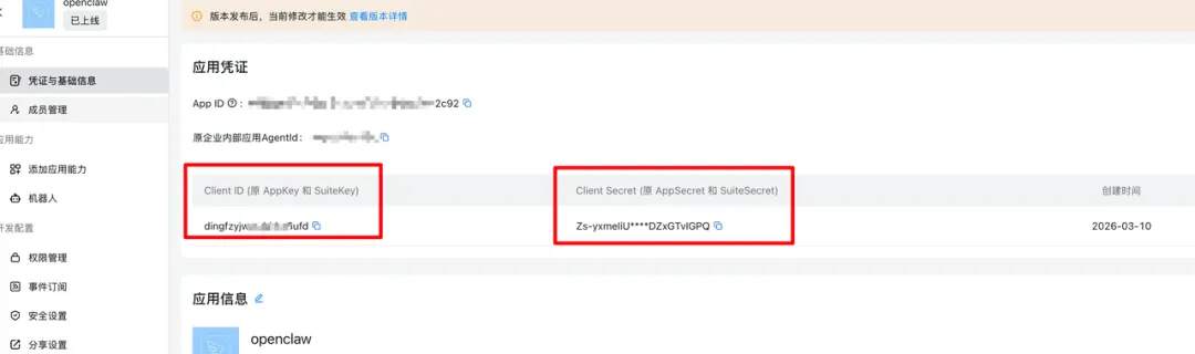 踩坑:页面上有好几个 ID,注意复制的是 ClientID 和 ClientSecret,不要复制成 AppId 或 GroupId,填错了 OpenClaw 会连不上。