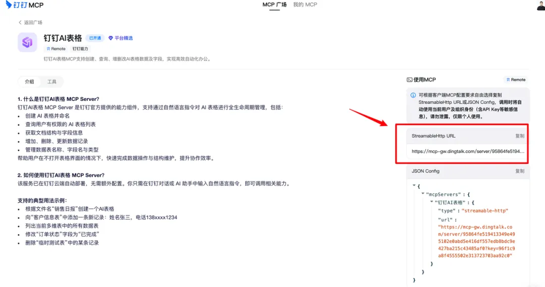 找到「AI 表格」MCP,点击进入,后复制Streamable HTTP URL。