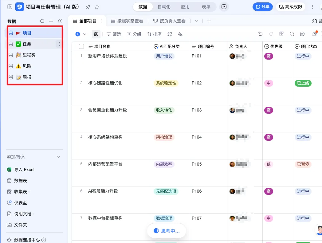 帮我创建一个项目管理表,需要包含项目主表、任务表、里程碑表、风险表、周报表,5张表自动关联。项目表包含项目名称、分类、项目编号、负责人、优先级、项目状态OpenClaw 会调用钉钉 AI 表格的 MCP 接口,直接帮我建好完整的表结构,字段都配好,可以看下面图片五张表结构很完善,