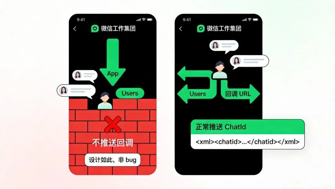 appchat = 应用管控群(单向)。普通内部群 = 应用作为成员的双向群。这两个词在企微文档里长得很像,但设计完全不同。