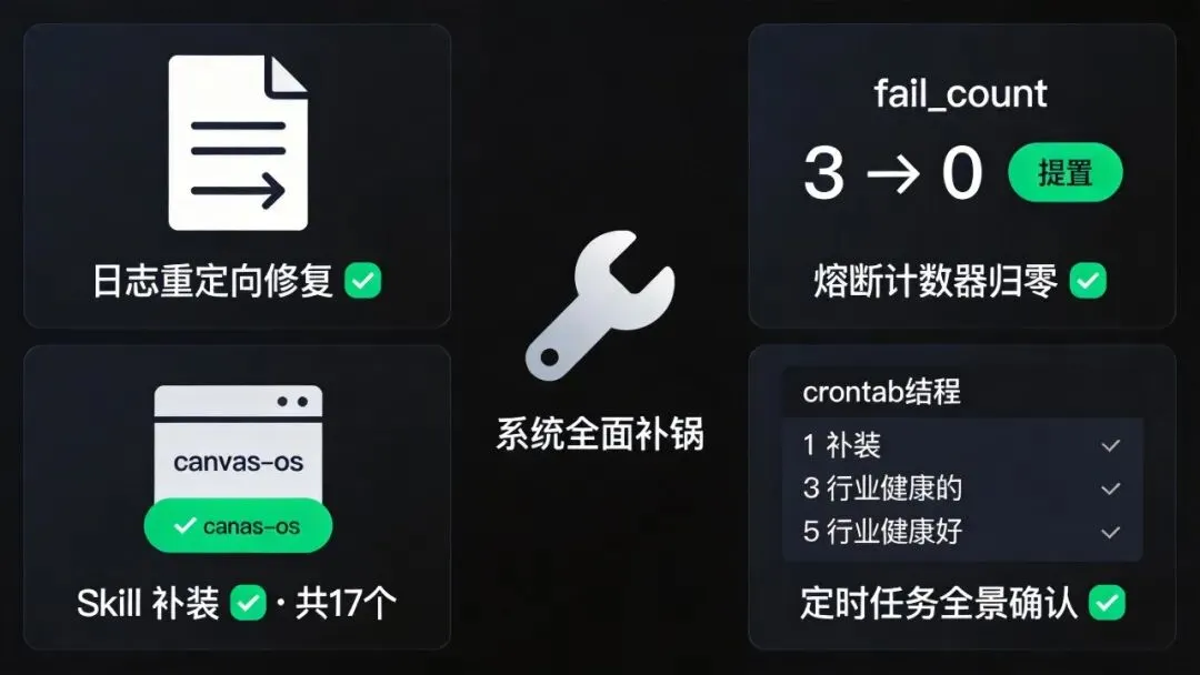 每次手动重启 Gateway 后,都要检查并归零 watchdog_fail_count,否则 watchdog 会一直保持熔断状态,下次崩溃就没有人自动拉起了。
