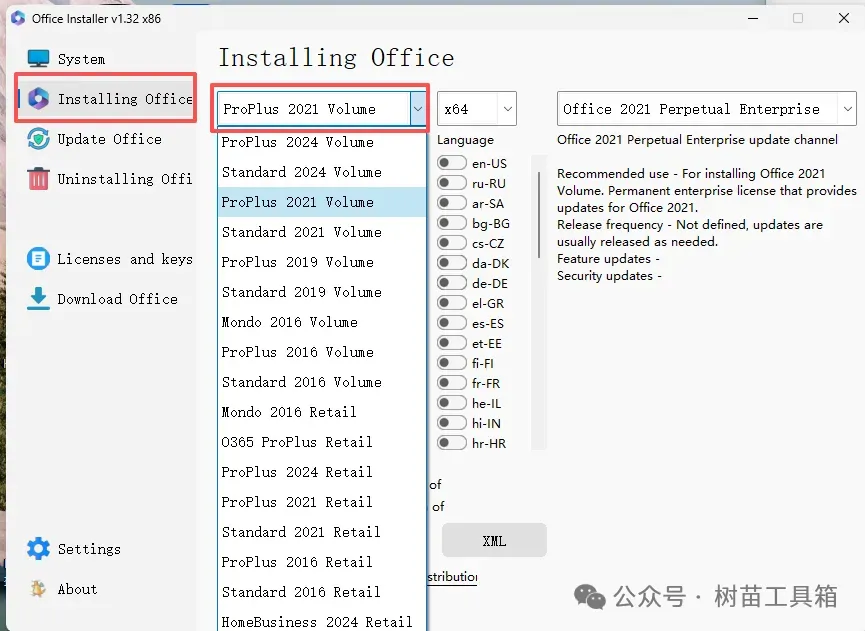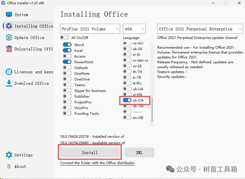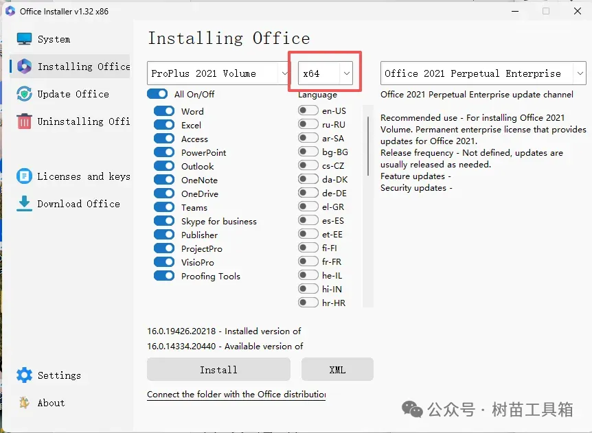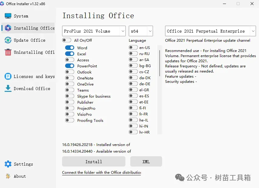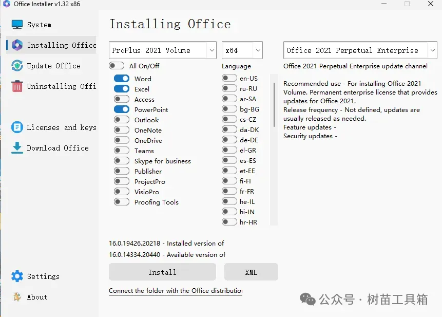 Office一键安装、激活、卸载工具!大家好,我是树苗工具箱,专注分享实用工具。日常办公经常要使用到office,经常遇到office要激活、找不到好用的工具等问题。今天分享这款office工具,免费使用,方便我们日常工作的需要。这款office工具就是office installer,本质上是office配置工具,支持office安装,更新,卸载、激活,可以选择安装office版本,一键安装,使用起来非常方便。2、选择安装,可以选择安装的版本,这里我们选择常用的proplus 2021 volume版本3、选择系统架构,目前主流电脑一般直接选x64就行,兼容性和性能都比较稳定。4、选择要安装的office组件,一般不用选择全部安装,有几个办公没有经常使用到,不用勾选,可以节省占用空间,把上面按钮的All on/off去掉,这里我勾选常用的办公三件套,word,excel和powerpoint。5、语言这里选择zh-CN(简体中文),安装即可。以上就是这款软件的介绍和使用教程了,如果你也需要,这款office配置工具值得一试。免责声明