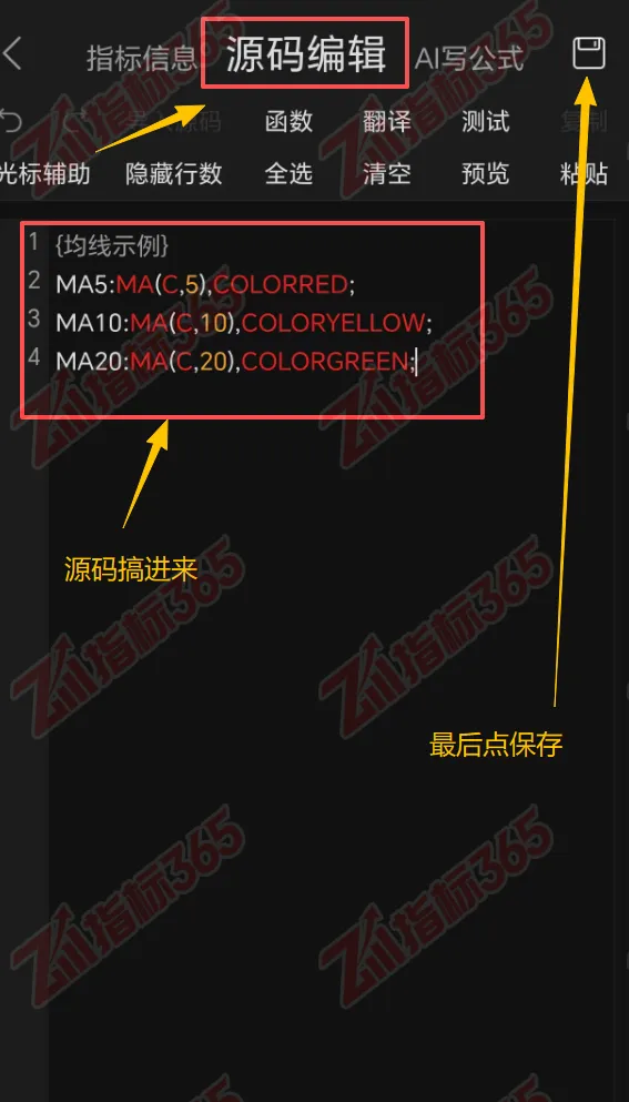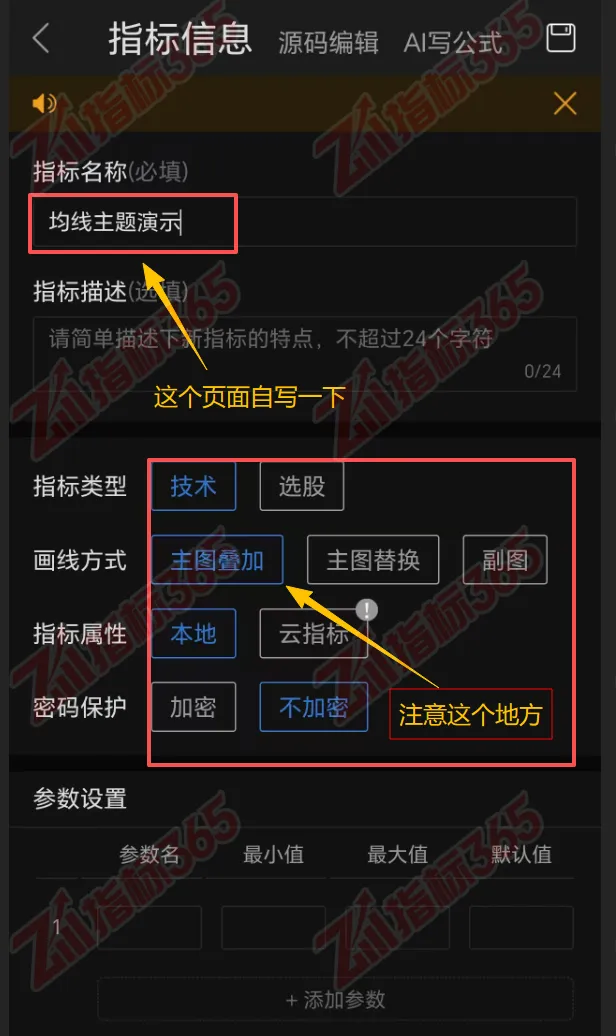 按照提示依次填指标名称、指标描述、指标类型、画线方式、指标属性、参数设置等。然后切换成到【源码编辑】标签,把你的文本格式的代码复制进去,点击右上角的【保存】。如下图所示: