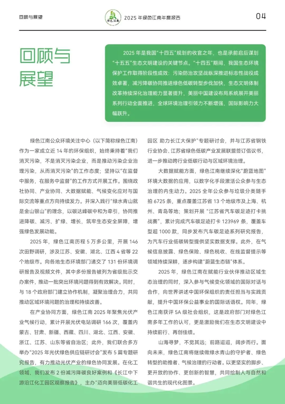 绿色江南公众环境关注中心(以下简称绿色江南)作为一家成立近14年的环保组织,始终秉持着"我们消灭污染,不是消灭污染企业,而是推动污染企业治理污染,从而消灭污染"的工作态度;坚持以"在监督中服务,在服务中监督"的工作方式开展工作。围绕政社协同、产业协同、大数据赋能、气候变化应对与国际交流等重点方向持续发力。并深入践行"绿水青山就是金山银山"的理念,以碳达峰碳中和为牵引,协同推进降碳、减污、扩绿、增长,筑牢生态安全屏障,增强绿色发展动能。