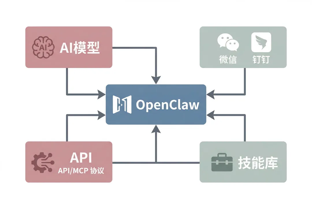 说白了,OpenClaw不是一个通用聊天助手。它是一个标准的 编排网关 。这个词听着唬人,我换个说法你就懂了,它是一个调度中心,把AI大模型、你的操作系统、你的即时通讯工具、各种外部API和MCP协议、Agent Skill,全部解耦之后重新组装到一起。