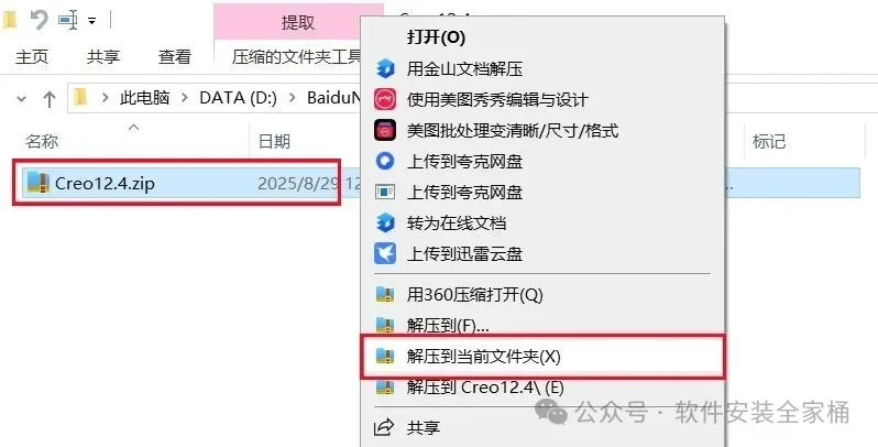 1.打开下载的Creo软件安装包,鼠标右击压缩包选择【解压到当前文件夹】。