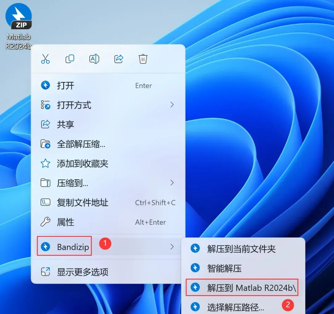 1、下载Matlab R2024b软件安装包到电脑上,右键选择【解压到Matlab R2024b\】。