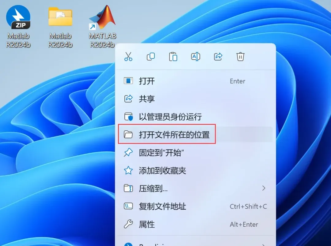 16、回到桌面,右键桌面上的【Matlab R2024b软件图标】,点击【打开文件所在的位置】