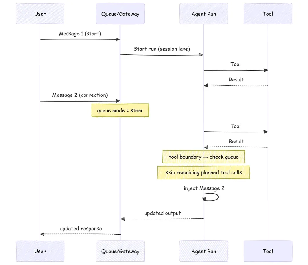 steer 模式选择了第三种方案:不中断正在运行的工具(保证安全),但一旦当前工具执行完毕,立刻停止后续计划,转而处理用户的纠正消息(保证响应性)。
