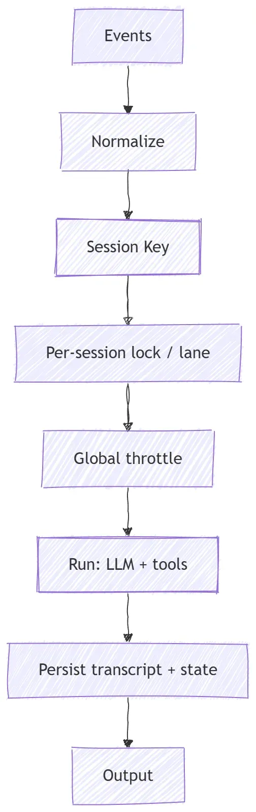 运行时(runtime)将工作按 session key 排入通道(lane) session:<key>,这样保证每个 session 同时只有一个任务活跃运行。