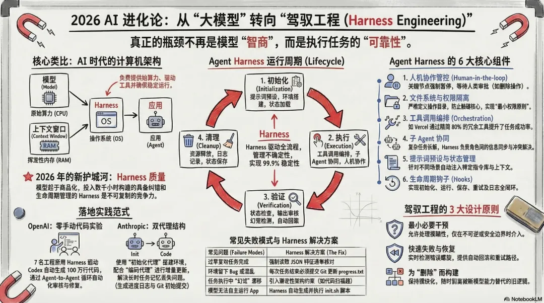OpenClaw真正的核心Agent Harness最近,在公司没事就看看OpenClaw的代码,毕竟是程序员出身的,都有想看看大神的代码涨什么样。但发现OpenClaw的代码更新的速度太快了,于是打开了OpenClaw的issue研究了一下。发现80%的issues都在做一个事情,就是Harness Agent的工作。于是,回来又把Harness Agent的原理看了一遍,有了新的体会。到目前为止,我发现如果中小企业没有成熟的AI架构,学Palantir成本太高,倒是可以尝试用OpenClaw最为最小内核,利用Palantir给出的架构原则,结合Agent Harness实践,倒是短时间内可以有一个相对来说可以落地的AI服务平台。目前,已经有客户和我们一起做类似的落地,有了阶段性的成果。下面介绍一下Agent Harness前提,为什么要做Agent Harness在长时复杂任务中(例如执行数百次工具调用或持续数日的工作流),大模型往往会在运行几十步之后开始偏离初始指令、忘记关键约束条件或产生幻觉,这种现象被称为“模型漂移”。为了解决这一落地难题,Agent Harness 作为“管控操作系统”,通过以下几个维度的核心机制对模型进行强行“兜底”和纠偏:1. 建立长时状态交接与动态上下文管理模型漂移的首要原因是上下文窗口有限且容易信息过载。Harness 摒弃了让模型在一个无限膨胀的上下文窗口中“死扛”的做法:上下文生命周期控制Harness 内置了自动压缩(Compaction)、修剪和会话重置机制,当 Token 数量过大或任务时间过长时,自动提炼关键信息并清理旧的上下文,防止历史信息污染推理。物理化的状态交接Harness 将长任务切分为多个离散的会话。它强制要求系统在开始时建立结构化的环境(例如生成 claude-progress.txt 进度文件和初始化 Git 提交)。在随后的每次新会话中,Agent 必须先读取进度日志和 Git 记录来“恢复记忆”,并在结束时更新日志,通过这种清晰的“状态交接”来确保任务连贯性。2. 采用渐进式披露(Progressive Disclosure)代替超长说明书试图用一个几千字的超长提示词或规则手册来约束 Agent,往往会导致其注意力分散、“模式匹配”失灵,从而引发漂移。Harness 转变了思路,将系统的真实知识体系(如架构设计、质量文档)结构化地持久保存在文件库中。它仅给 Agent 注入一个简短的“目录”(例如 100 行的 AGENTS.md 作为地图),Agent 在执行长时任务时,根据当前步骤的需要逐步查阅深层文档。这确保了 Agent 随时都能获取准确的局部规则,而不会被过量信息淹没。3. 引入机械化约束与系统级验证防止漂移不能仅仅依赖大模型自身的语言逻辑,必须依靠坚固的“物理护栏”:强制架构约束Harness 通过融合确定性的自定义代码检查器(Linters)和结构测试框架,为 Agent 划定绝对的行为边界(例如强制限定模块的依赖方向和接口规范)。一旦 Agent 输出的代码违规,系统会直接拦截并要求重写。状态级验证替代语言验证Harness 赋予 Agent 真实的测试工具(如带有视觉能力的 Puppeteer 浏览器自动化工具),强制要求 Agent 像人类一样在真实环境中测试其结果(例如点击网页、查看界面是否正确渲染、接口是否报错)。通过真实的“系统状态”而非 LLM 的“嘴上说完成”来确认任务进度,大幅减少了虚假幻觉。4. 自动执行“垃圾回收”对抗系统熵增在长时任务中,随着 Agent 的不断操作,工作环境(如代码库、文档)会不可避免地产生混乱和技术债(即“熵增”),这会导致 Agent 复制早期的错误模式并进一步放大漂移。Harness 设立了专门的后台监控和清理 Agent,定期扫描整个系统。这些 Agent 会自动找出偏离规范的代码、过期的文档或无效的工具调用逻辑,并主动发起重构(Pull Request)进行修复。通过这种持续的小步清理机制,Harness 确保了长时运行的系统始终处于高质量和高一致性的状态。5. 将漂移转化为训练数据,实现底层能力进化从更宏观的视角来看,Harness 也是解决未来模型漂移问题的核心数据收集器。它能够将 Agent 模糊的多步骤工作流转化为高度结构化的运行数据(包括每一步的工具调用、推理过程和失败节点)。当模型在第 100 步未能遵循指令发生漂移时,Harness 会精确捕捉这一轨迹。各大 AI 实验室将利用这些由 Harness 捕获的真实场景反馈数据,直接用于下一代模型的训练,从而从根本上优化模型的长时推理能力,打造出在复杂任务中“不疲劳”的底层引擎。第一,什么是Agent Harness及其在AI系统中扮演的角色?Agent Harness是包裹在AI模型外围,专门用于管理长时运行任务的软件基础设施。它既不是Agent本身,也不是单纯的开发框架,而是一个负责规范、引导、管控Agent运行全生命周期的系统。它的核心目标是保证Agent在长时任务中始终保持可靠、高效、可调控的状态,从而解决模型在执行数百次工具调用或多日工作流时容易出错的“模型漂移”现象。在AI系统中,业内公认将Agent Harness扮演的角色类比为计算机的“操作系统”:CPU(算力核心)AI模型提供最基础的原始处理能力。RAM(工作内存)模型的上下文窗口负责临时存储任务过程中的关键信息。操作系统(Agent Harness)负责管理和调度算力资源、优化内存使用、提供标准的驱动程序和运行环境,让上层应用能够在稳定的基础上运行。具体应用(APP)开发者构建的AI Agent则是运行在这个“操作系统”之上的应用,负责实现特定的业务逻辑。具体而言,Agent Harness在AI系统中发挥着以下几个维度的核心作用:提供开箱即用的标准化运行环境与只提供基础“积木”的A