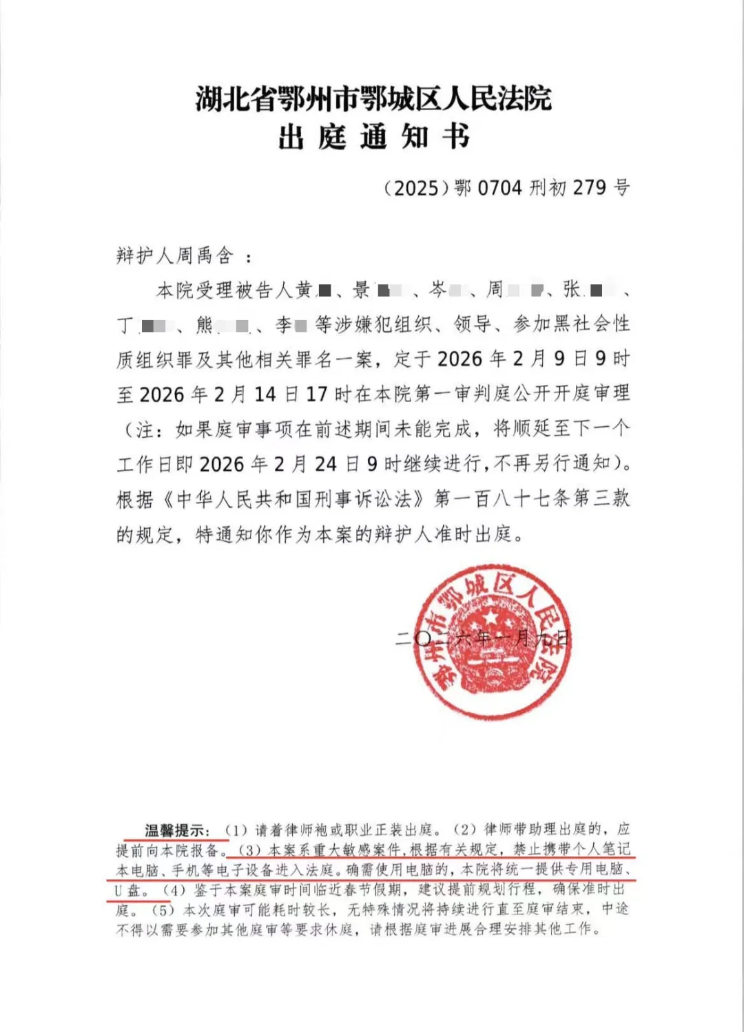 2026年1月9日,他收到了湖北省鄂州市鄂城区人民法院向其发送的电子版出庭通知书。页脚处的文字格外醒目:“本案系重大敏感案件,根据有关规定,禁止携带个人笔记本电脑、手机等电子设备进入法庭。确需使用电脑的,本院将统一提供专用电脑、U盘。”