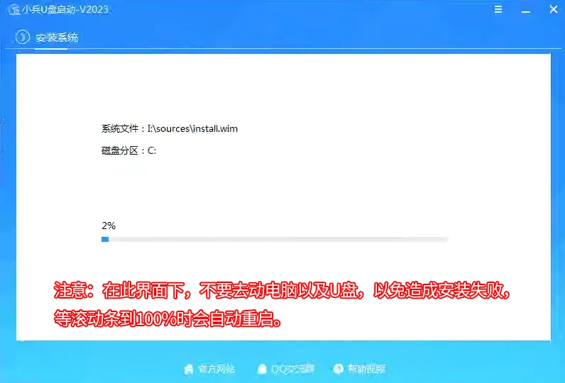 打开"小兵系统安装"工具(或类似的安装工具)。工具会自动检测 U 盘和硬盘信息。选择系统镜像文件。如果镜像在 U 盘里,直接选择 U 盘里的 ISO/WIM/ESD 文件。工具会自动识别并加载镜像。选择安装分区(目标盘符,一般情况是C盘),建议打开Diskgenius分区工具确认你选择的系统盘符。选择错误会导致安装失败!点击一键安装后,开始挂载系统镜像(boot.wim为启动引导映像,install.wim为系统映像),挂载后选择【install.wim文件】,然后点击【确定】,接着选择要安装的版本即可,然后等待释放系统安装程序,电脑便会自动重启电脑,该过程请等待即可会自动重启安装。点击"一键安装"或"开始安装",工具会自动挂载镜像、复制文件、注入驱动、配置引导。这个过程可能需要 10-30 分钟,取决于系统大小和硬盘速度。💡 驱动注入: 小兵 PE 会自动检测硬件并注入所需驱动,包括 Intel VMD、USB 3.x、网卡驱动等。这是相比原版安装镜像最大的优势,可以避免安装后蓝屏或无法上网的问题。点击安装后,工具会自动执行以下操作: