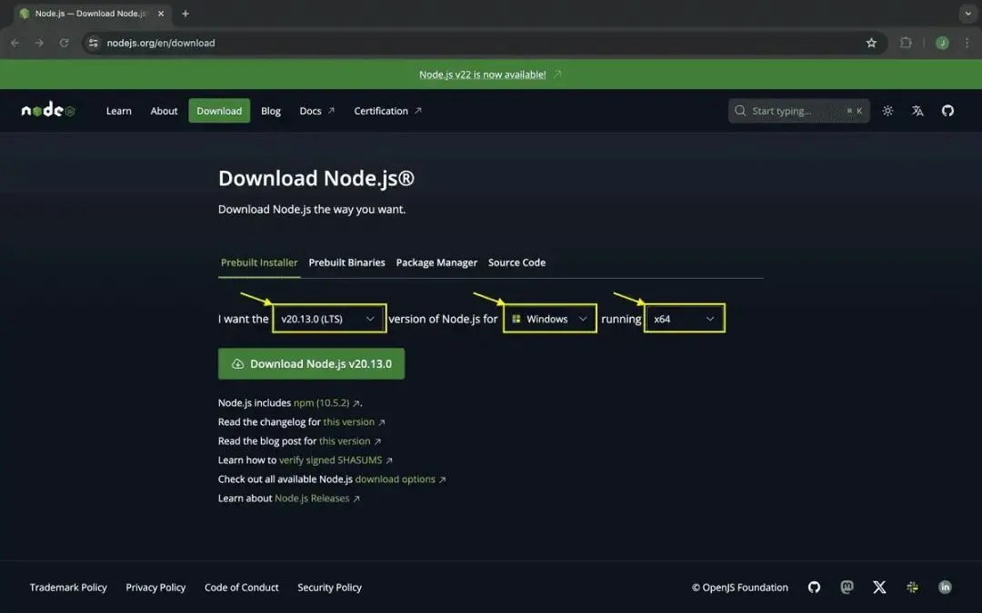 OpenClaw 基于 Node.js 运行,必须先装 Node.js 22.0+