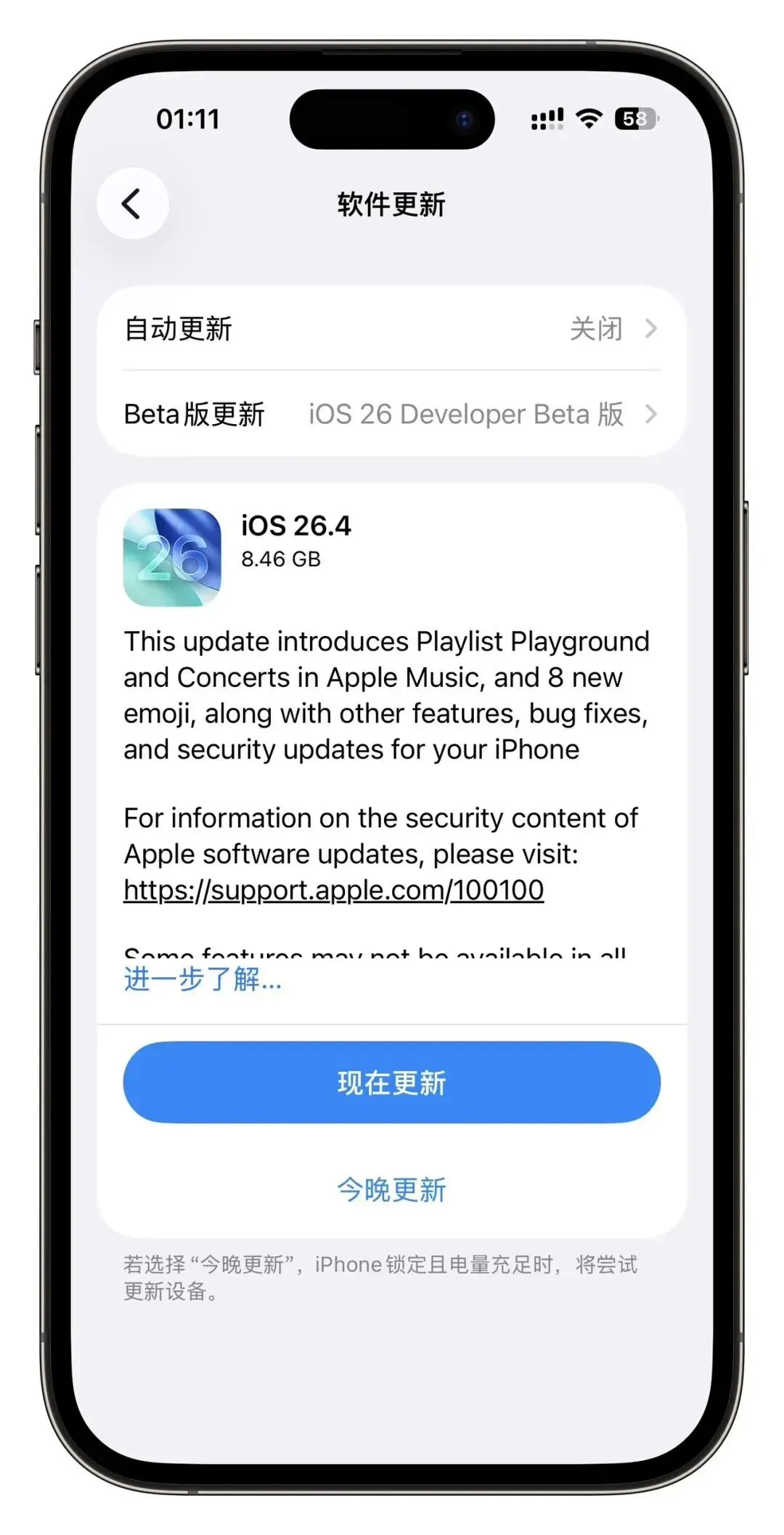 - 全新 Apple 账户设置界面 - 调整 App Store 与游戏应用搜索栏位置 - 新增减弱明亮效果开关 - 上线 8 款全新表情符号 - 部分系统墙纸支持获取与移除 - Apple Music 新增附近音乐会、专辑封面沉浸展示 - 新增 2 款环境音乐小组件 - 提醒事项加入紧急模块 - 桌面编辑与控制中心适配液态玻璃效果