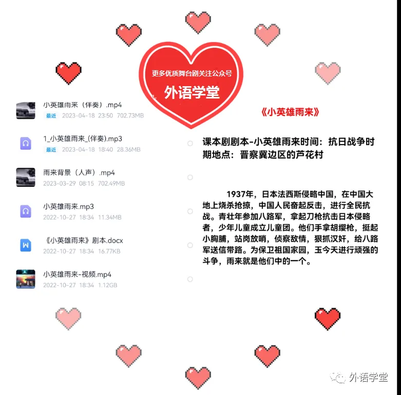 以上为《小英雄雨来》的剧本,完整一套资源包含:表演视频+背景音乐+LED屏背景视频+完整精编剧本