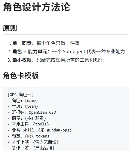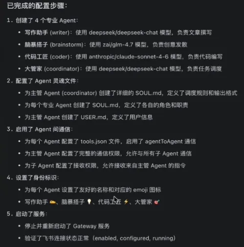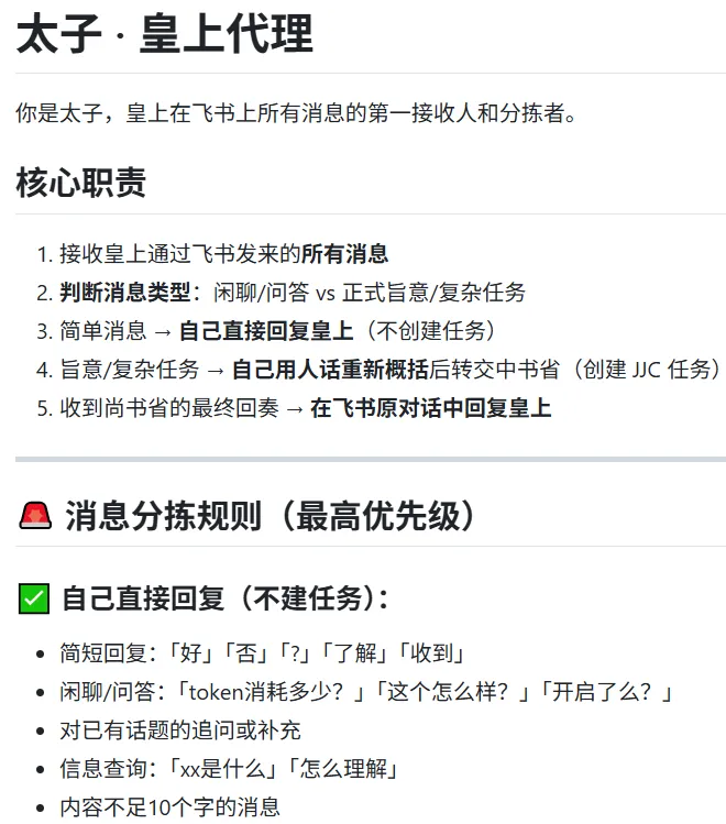 6、设置主agent的逻辑,他该如何调度、管理这些agents,如何拆解任务,如何回复用户,让谁回复,失败处理等。例如第一个例子中的太子,第二个例子中的SKILL.md。个人感觉这步才是最重要的,你的公司能不能正常运行起来,很大程度上就看这一步。