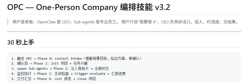 在OpenClaw-Agents:Sub-Agent与Multi-Agent中,介绍了两种多Agents的方式,本文将介绍一人公司OPC这种模式,并结合前文,介绍下他们所用到的一些方法。目前大概有3种实现方式: