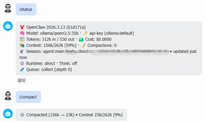 这也意味着,当上下文超过256K时,上下文会丢失,OpenClaw会忘记一些事情,如果任务过程你甚至会看到乱跑的现象,那么怎么查看当前上下文呢,可以在聊天窗口通过以下一些命令触发和上下文有关的操作: