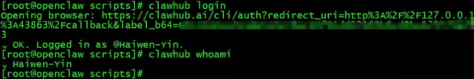 虽然前一期展示了在默认限速情况下如何安装Skill,但是还是非常麻烦,且相对来说容易出问题。其实Clawhub为了避免滥用导致的带宽占用,对未登录的操作都是做了非常厉害的限速的,而登陆后的速度则会非常快。可以通过以下命令实现: