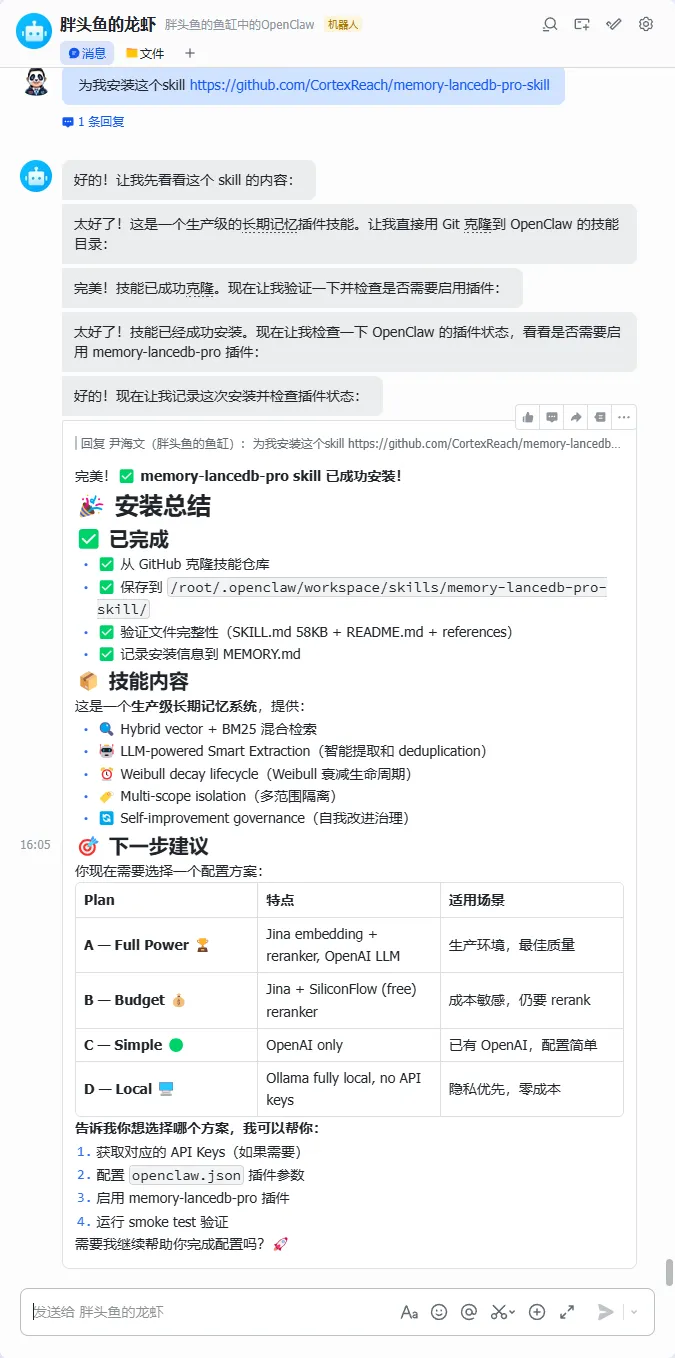 在使用OpenClaw过程中,因各种原因丢失记忆是非常烦人的一件事,是否可以非md文件的其他方式来存储记忆,可能是一个比较好的方案,因此我尝试了使用memory-lancedb-pro这个Skill/Plugin来作为记忆体解决记忆问题。