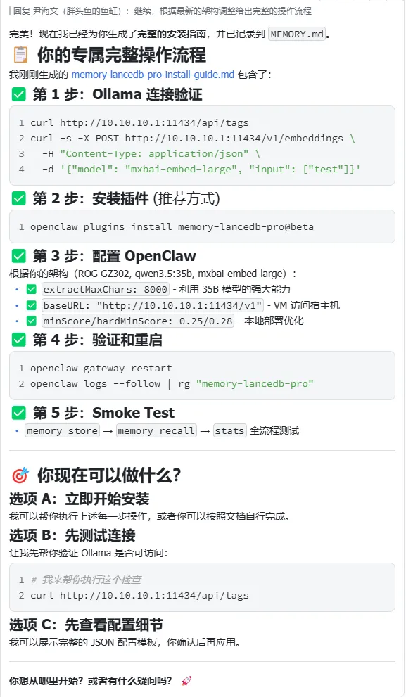 接下里我通过聊天方式,在Ollama下载了mxbai-embed-large向量嵌入模型之后,告诉OpenClaw当前的运行架构环境,然后OpenClaw给出了安装流程: